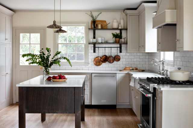 The experts consider this the most efficient floor plan. It uses three adjoining walls in a logical sequence of activity between storage areas, sink and stove.
